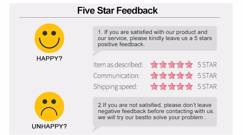 If you are satisfied with our products and services, please leave your positive feedback and 5 star, this will be greatest support for us;If you don't satisfied our porducts, pls contact us before you leave neutral (3 stars) or negative (1-2 stars) feedback.We guarantee we will 100% slove any problems for you.Please contact us before you leaving the negative feedback or opening any dispute on the site.Communication is the best way to solve the problems.